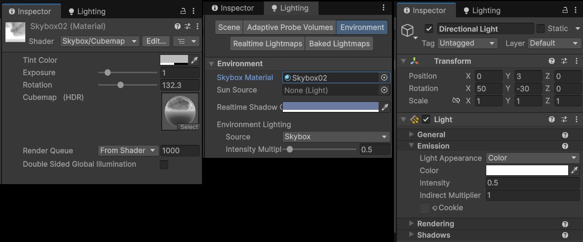 To make the robot avatar feel more grounded in the scene, it’s lighting needs to be as close as possible to the visible environment. I’m using a custom skybox and some tweaks to the environment and directional lighting settings. Also, I added a blob shadow beneath the robot. It’s basically a quad with a grayscale transparency texture.